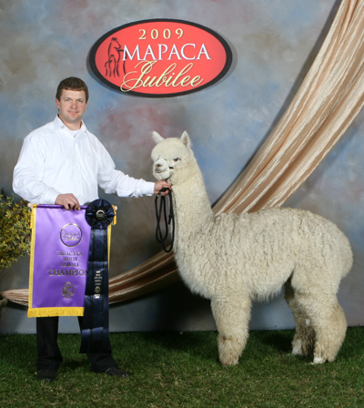 CCNF Priam (CCNF Pristine x Snowmass Matrix Majesty) – Champion White Huacaya Male