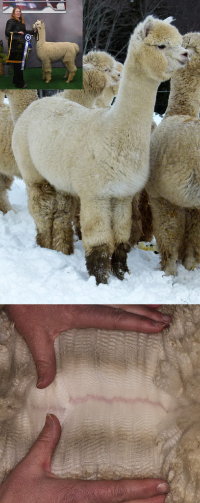 We are proud to announce that our white yearling show female, CCNF Sweet Confection, will be offered as lot #10 at the upcoming 2018 Futurity Sale, to be held on April 14 in Kansas City, MO! Sired by 2017 Futurity Herdsire of the Year, CCNF Elixir, and out of our 6Peruvian Monarch daughter, Sugar Snow, Sweet Confection comes straight out of our show string. It is not by chance that we have chosen to offer her at the very venue where originally both her sire (Elixir was the 2012 Futurity Light Champion & JC Huacaya Male as a young lad) and then she herself, along with her paternal siblings, made a statement last year, not only helping Elixir to garner both Light and Large Breeder Herdsire of the Year, but also to win the ultra-competitive light Get-of-Sire class itself. It probably wasn’t a fluke. 😉