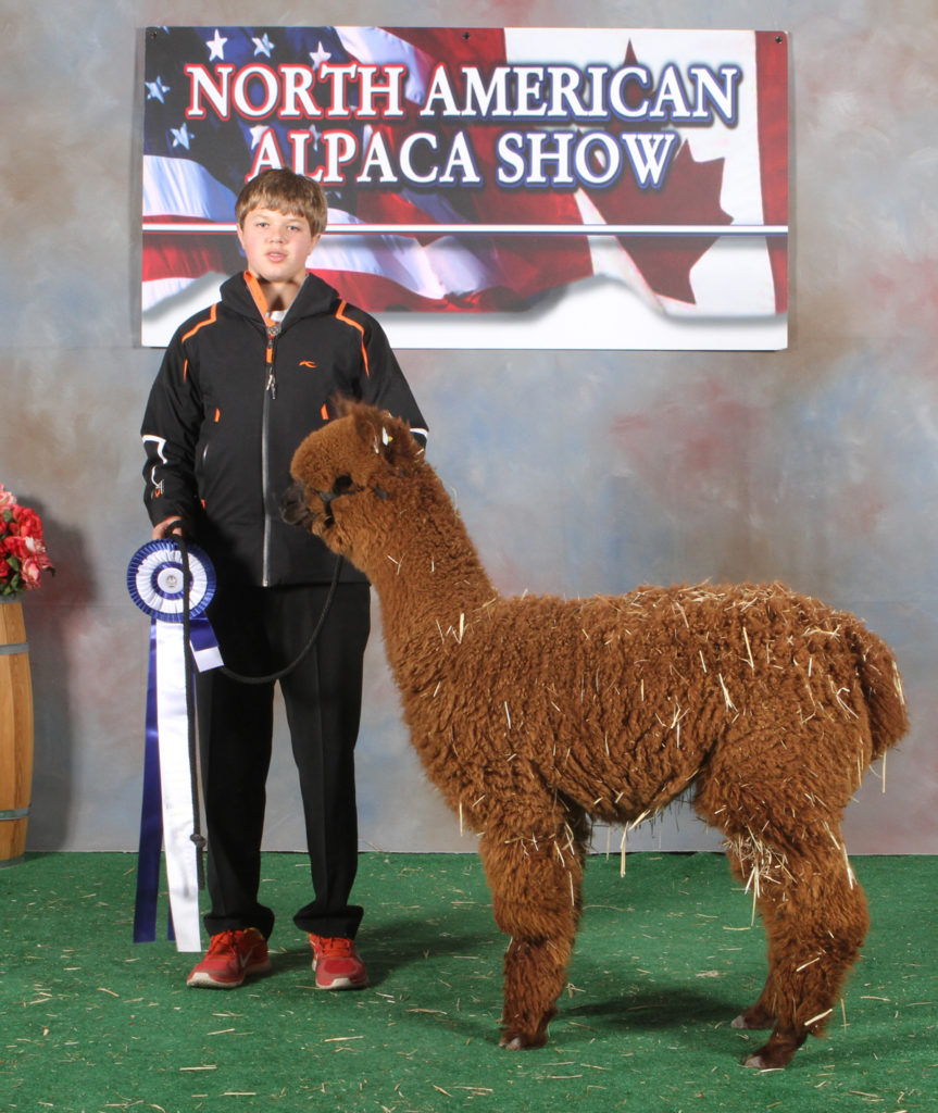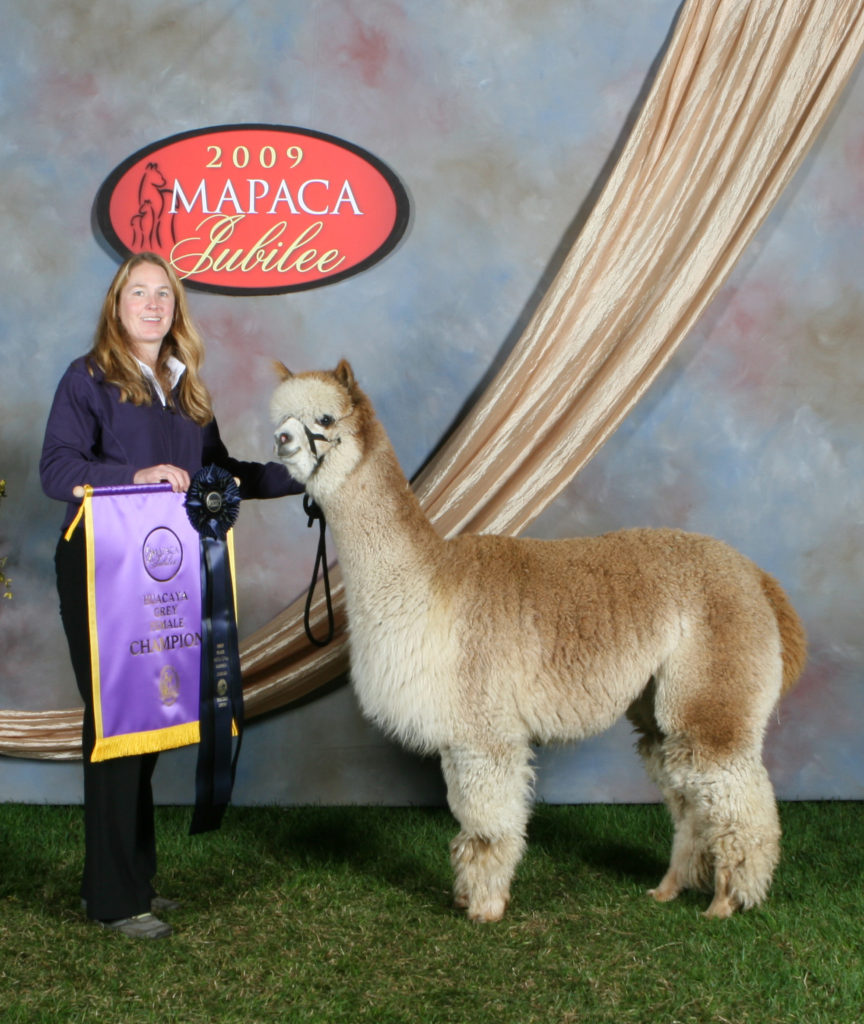 Born here in 2007, Marguerite was a daughter of Ring Ridge Daisy (ARI/AOA #181093), a female who joined our breeding program in 2002, as part of the female component of our then 50% acquisition of the North American Alpaca Stud, and CCNF Royal Ring of Fire (ARI/AOA #851781). As I write this and look at her pedigree, the first phrase that enters into my mind is “hybrid vigor!” Born in an era of the US alpaca business when “full-Peruvian” was still a tagline being routinely hyped throughout the industry (some of it justifiably, much of it just utter hogwash), it may very well have been her partial Chileanness — we’re channeling Hank Azaria in The Bird Cage here — that has ultimately led to her durability. Though a prominent member of our show teams as a young female, it is in point of fact Marguerite’s performance as a valued member of our production herd that has made her a stand out over time.